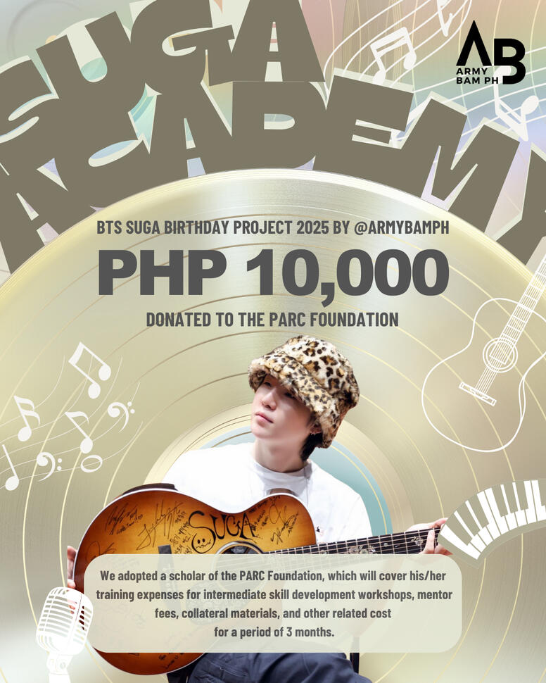 HAPPY SUGA DAY ππ±To celebrate Sugaβs birthday, @armybamph has adopted a scholar of the PARC Foundation which will cover his/her training expenses for intermediate skill development workshops, mentor fees, collateral materials, and other related costs