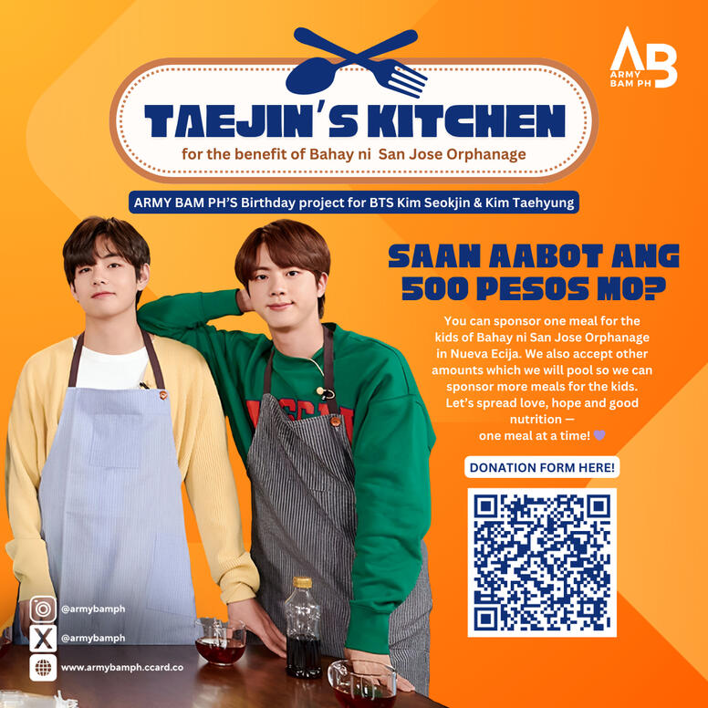 Army Bam PH in partnership with Bahay ni San Jose Orphanage celebrate BTS Jin and V's birthday with a feeding campaign!For 500 pesos, you can sponsor one meal for the kids of Bahay ni San Jose Orphanage in Nueva Ecija. We also accept other amounts which we will pool so we can sponsor more meals for the kids.Letβs spread love, hope and good nutrition β one meal at a time!