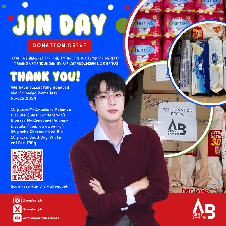 To celebrate BTS Jin's birthday, ARMY BAM PH has collectively donated essential food and hygiene items for the victims of Typhoon Pepito in Catanduanes. (through Tabang Catandugan by UP Catandungan Los Banos)Thank you for your generosity, ARMY! β€οΈππ